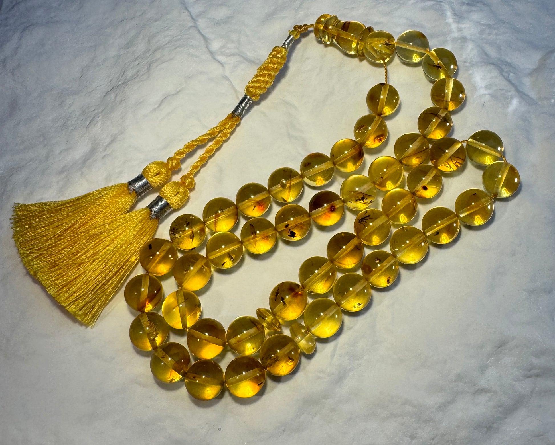 This rare and exquisite Baltic Amber Insect Tasbih is a true collector’s treasure. Each of the 45 transparent beads contains unique natural inclusions, with some preserving prehistoric insect details — a signature of authentic Baltic amber formed over millions of years.