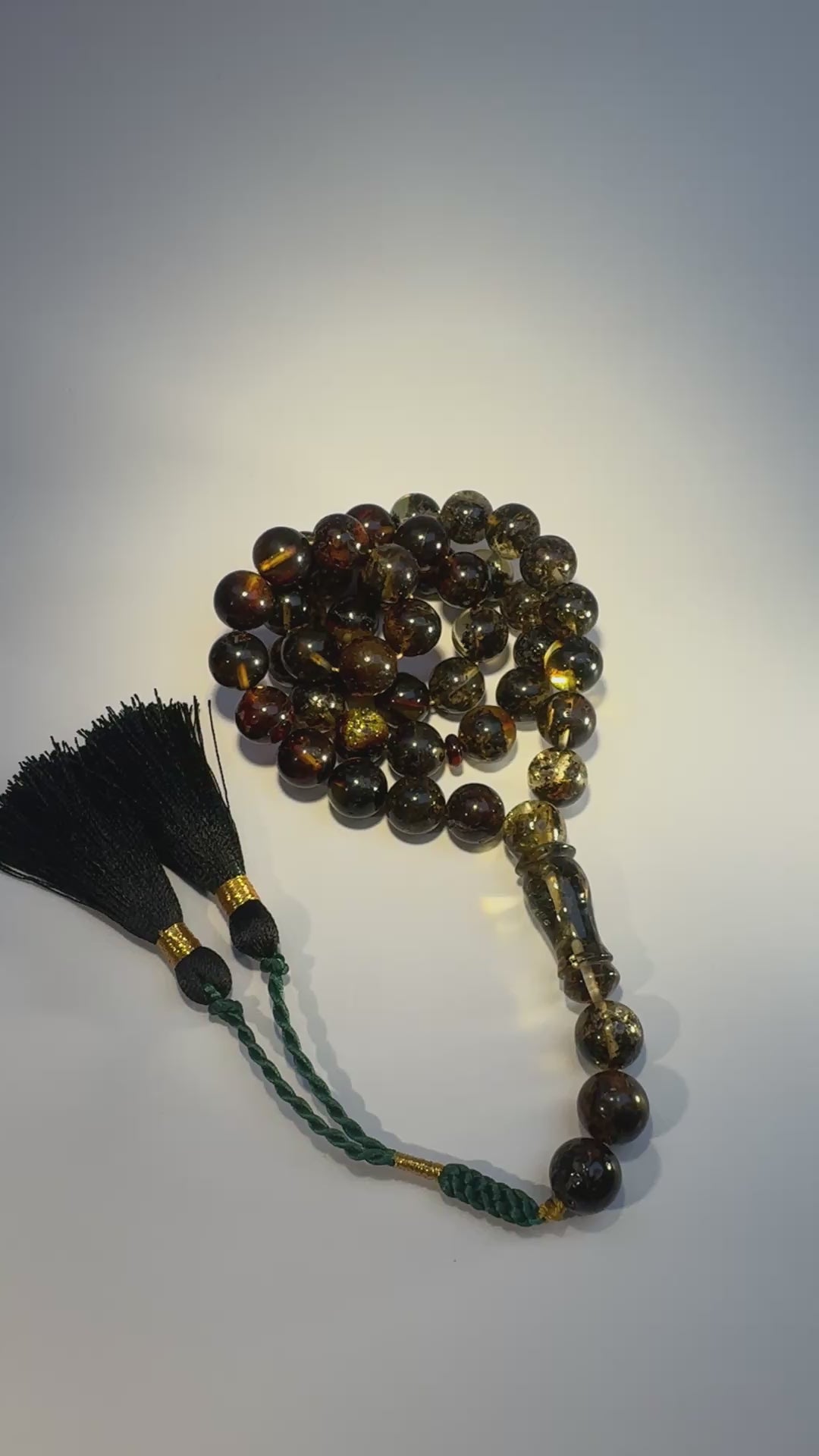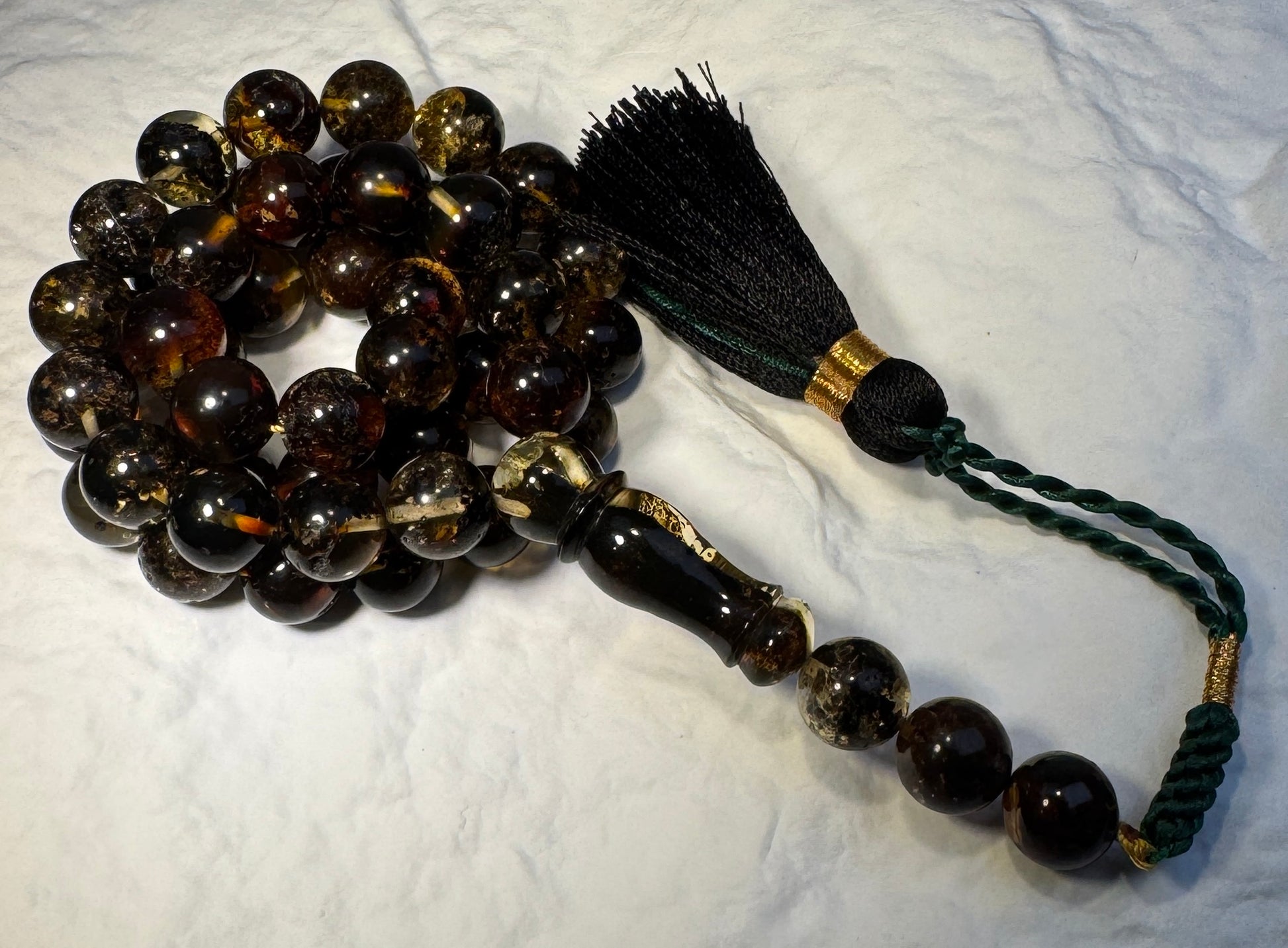 This elegant tasbih is handcrafted from authentic Baltic Amber, showcasing natural variations of deep cognac, honey, and golden tones. Each round bead reveals unique inclusions within the amber, a hallmark of its organic origin and age.
