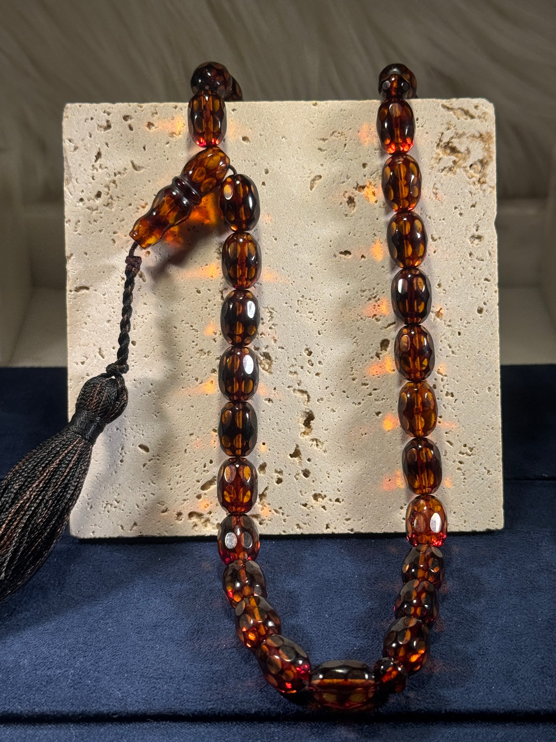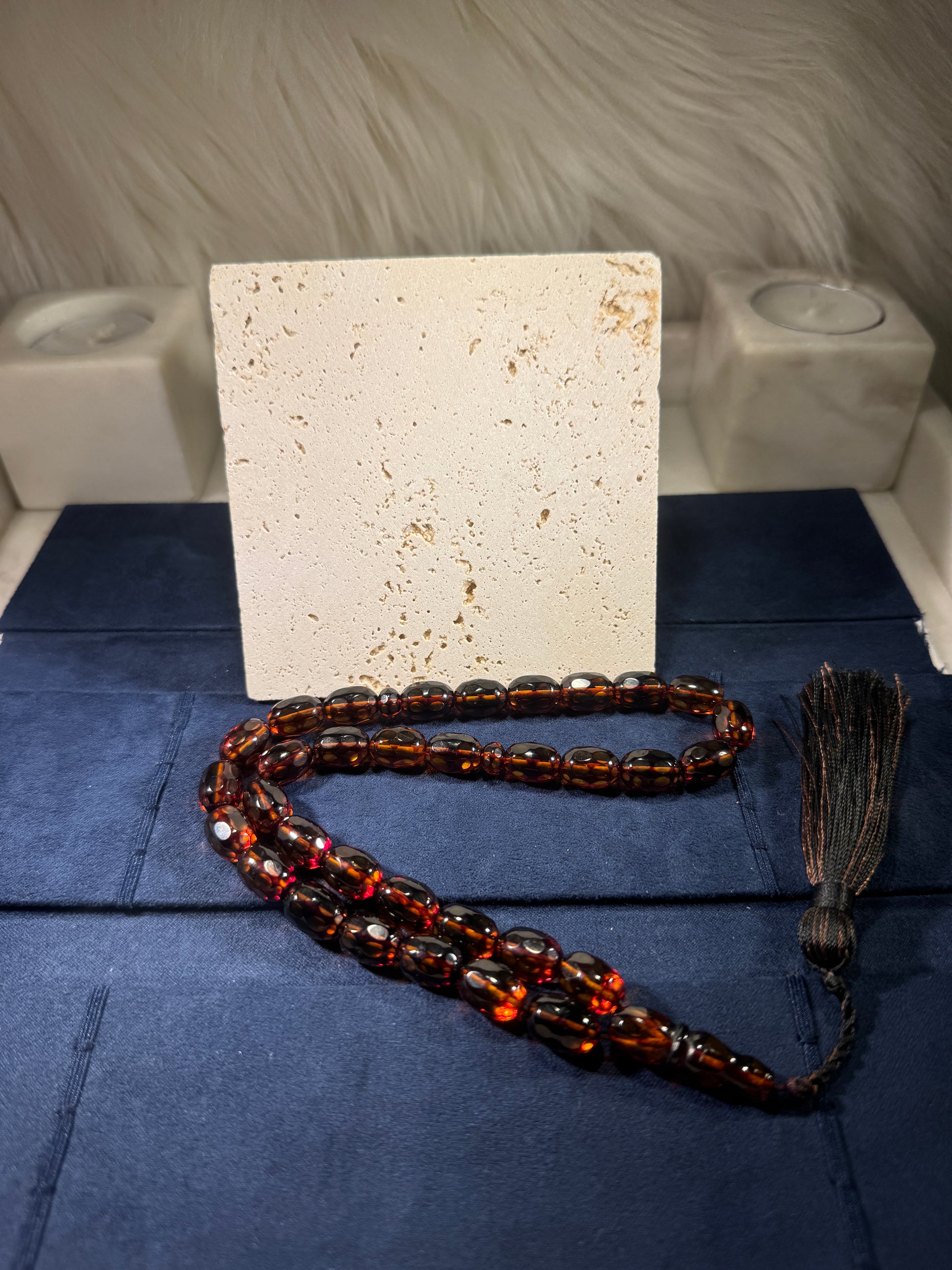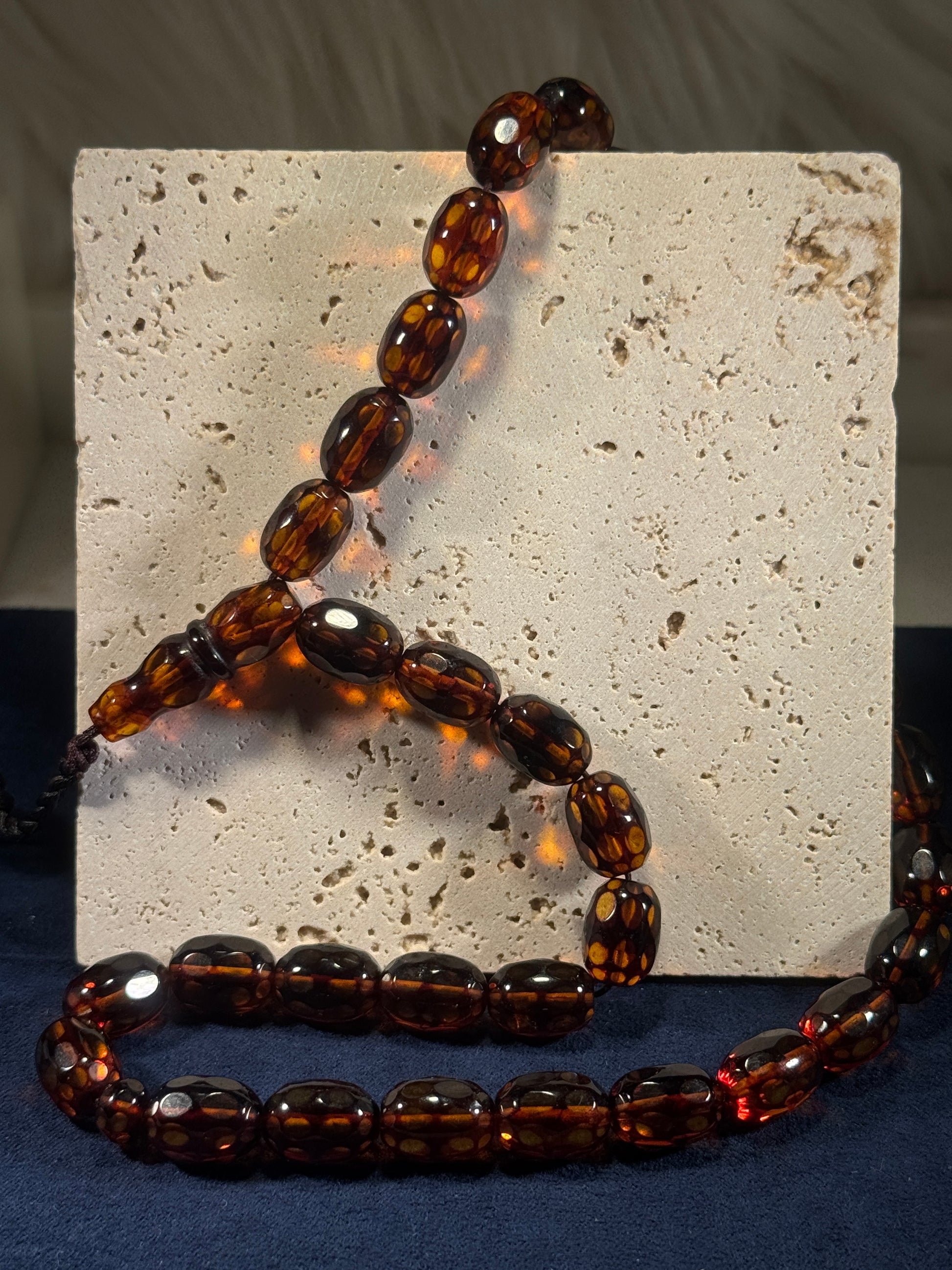 This elegant 33-bead tasbih is crafted from natural Russian amber, featuring perfectly polished 14x9mm oval beads in a stunning deep cognac tone. Its smooth texture, warm amber glow, and rich visual depth make it a pleasure to hold for dhikr, reflection, or gifting.