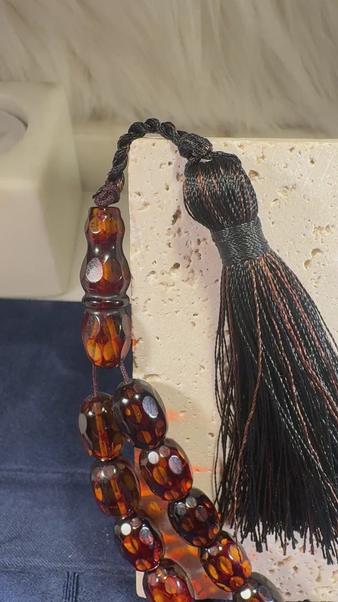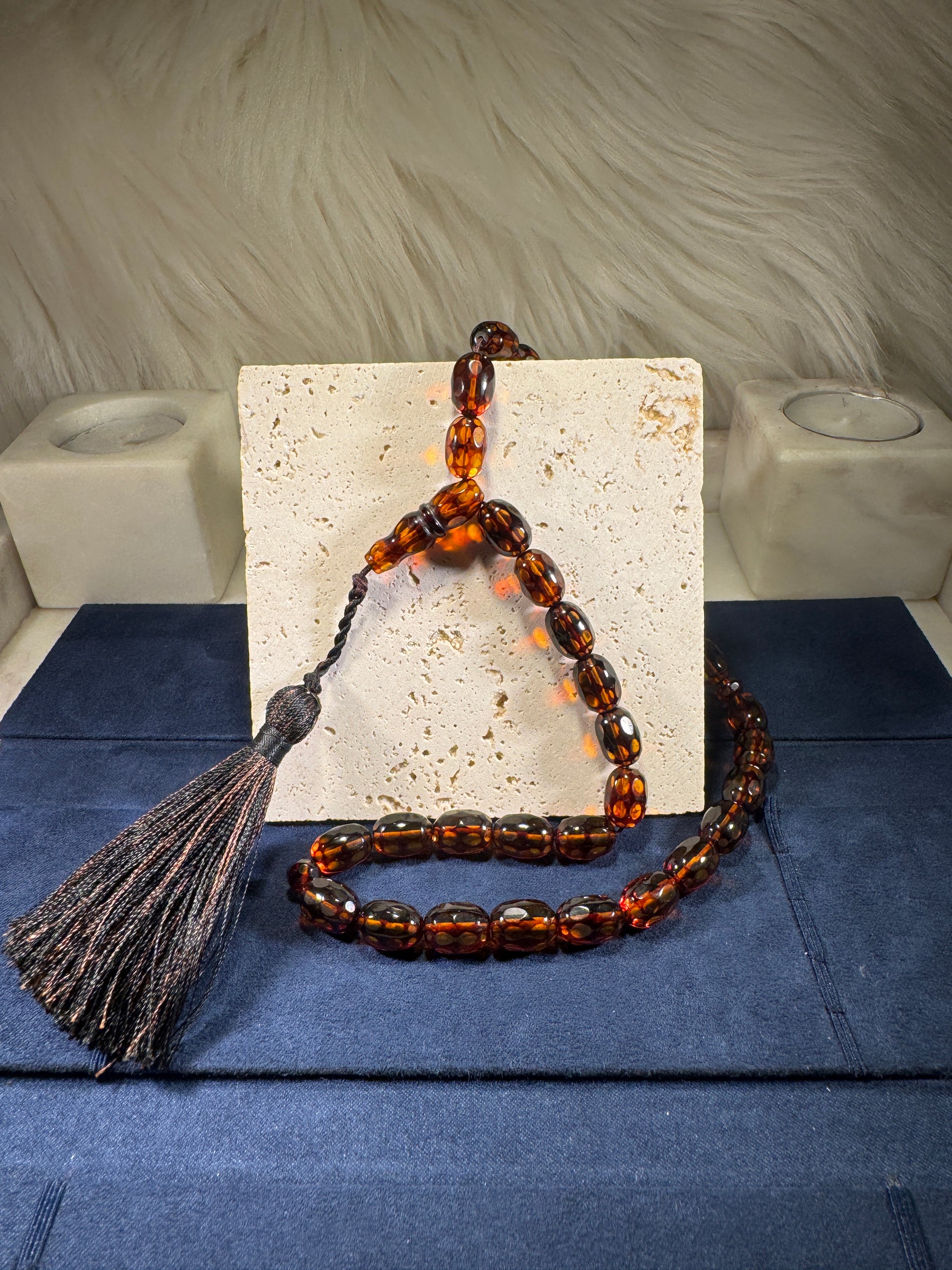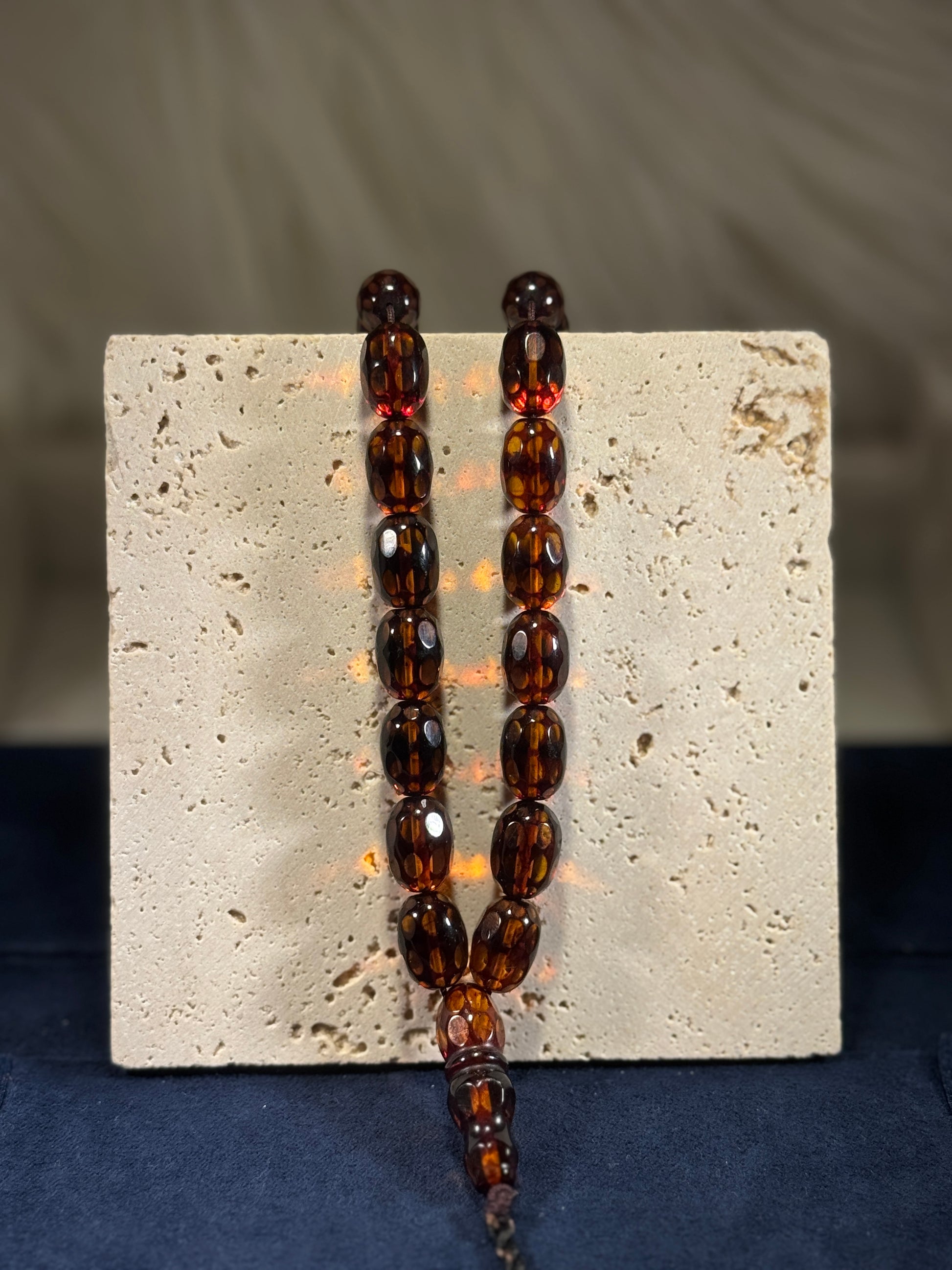 This elegant 33-bead tasbih is crafted from natural Russian amber, featuring perfectly polished 14x9mm oval beads in a stunning deep cognac tone. Its smooth texture, warm amber glow, and rich visual depth make it a pleasure to hold for dhikr, reflection, or gifting.
