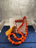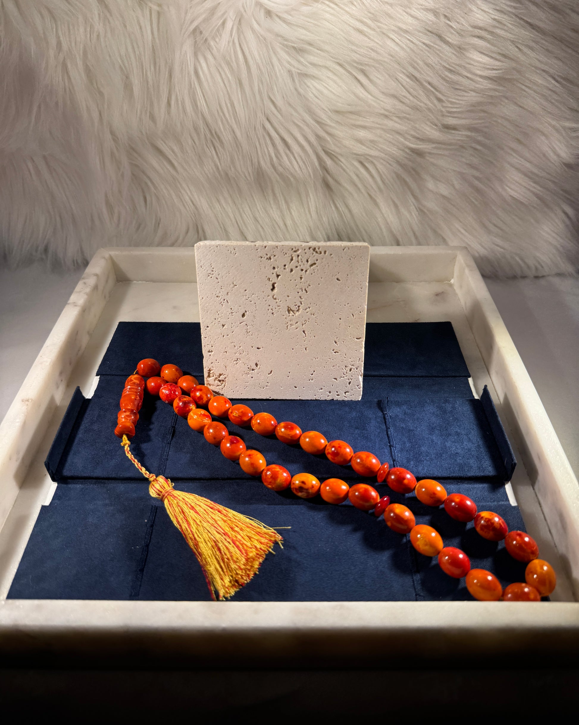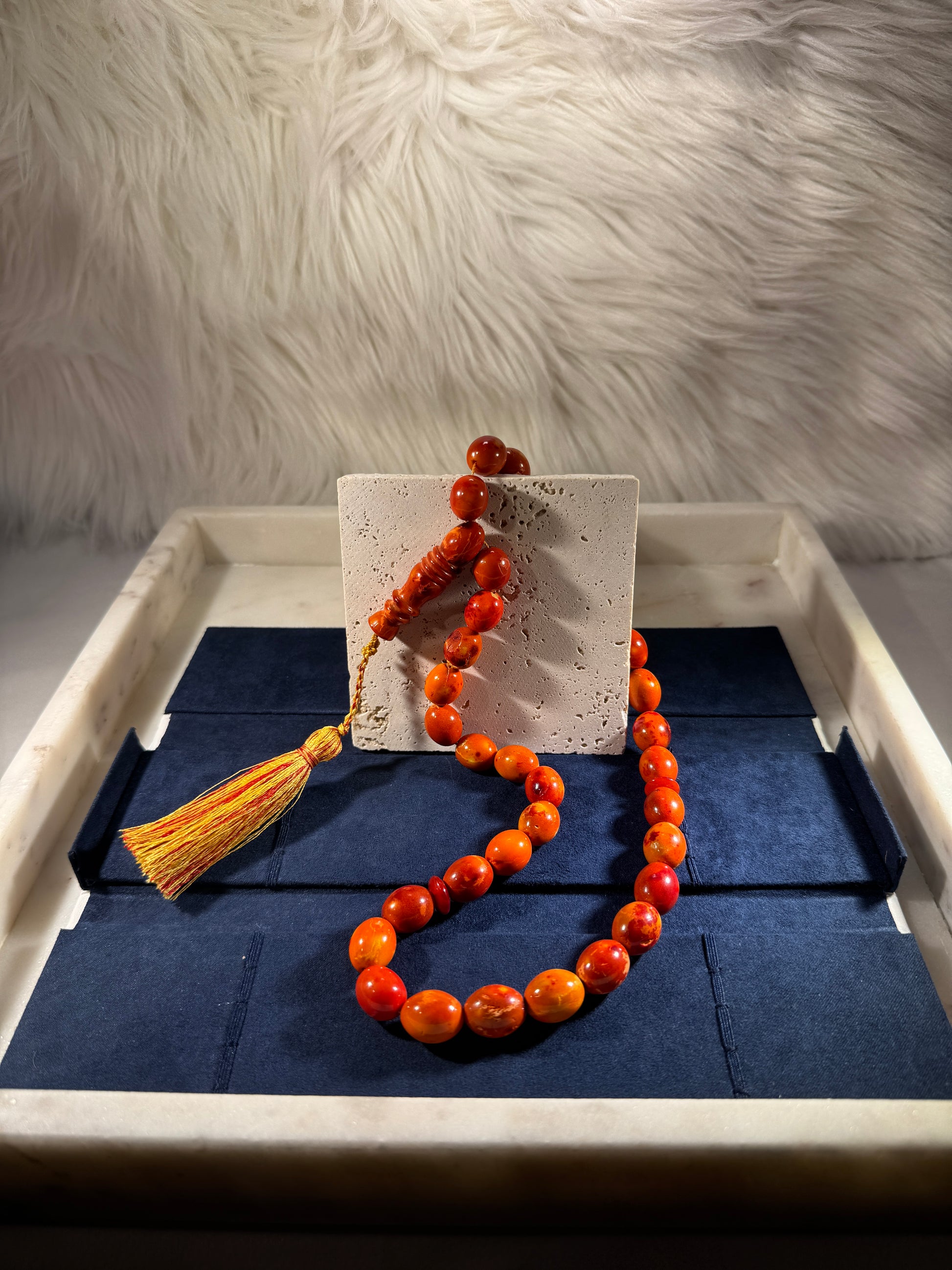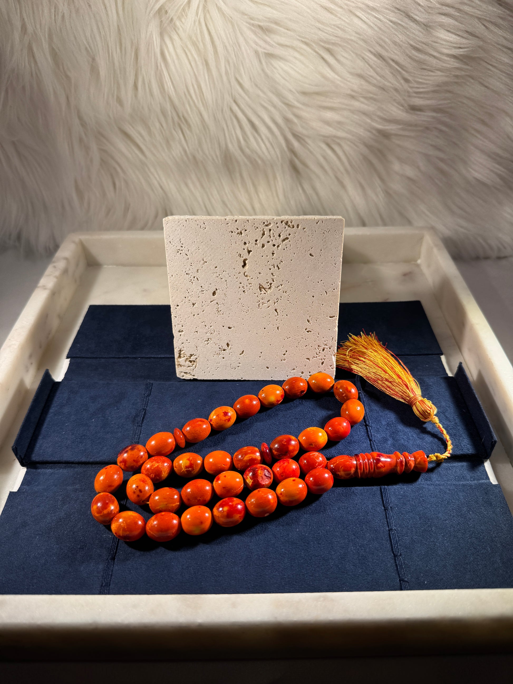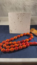This antique-style Baltic amber misbaha is a luxury prayer and meditation bead set crafted from natural amber. The warm reddish-golden tones and organic marbling patterns give each bead a unique, timeless beauty. Perfect for daily use, meditation, or as part of an amber collector’s display.