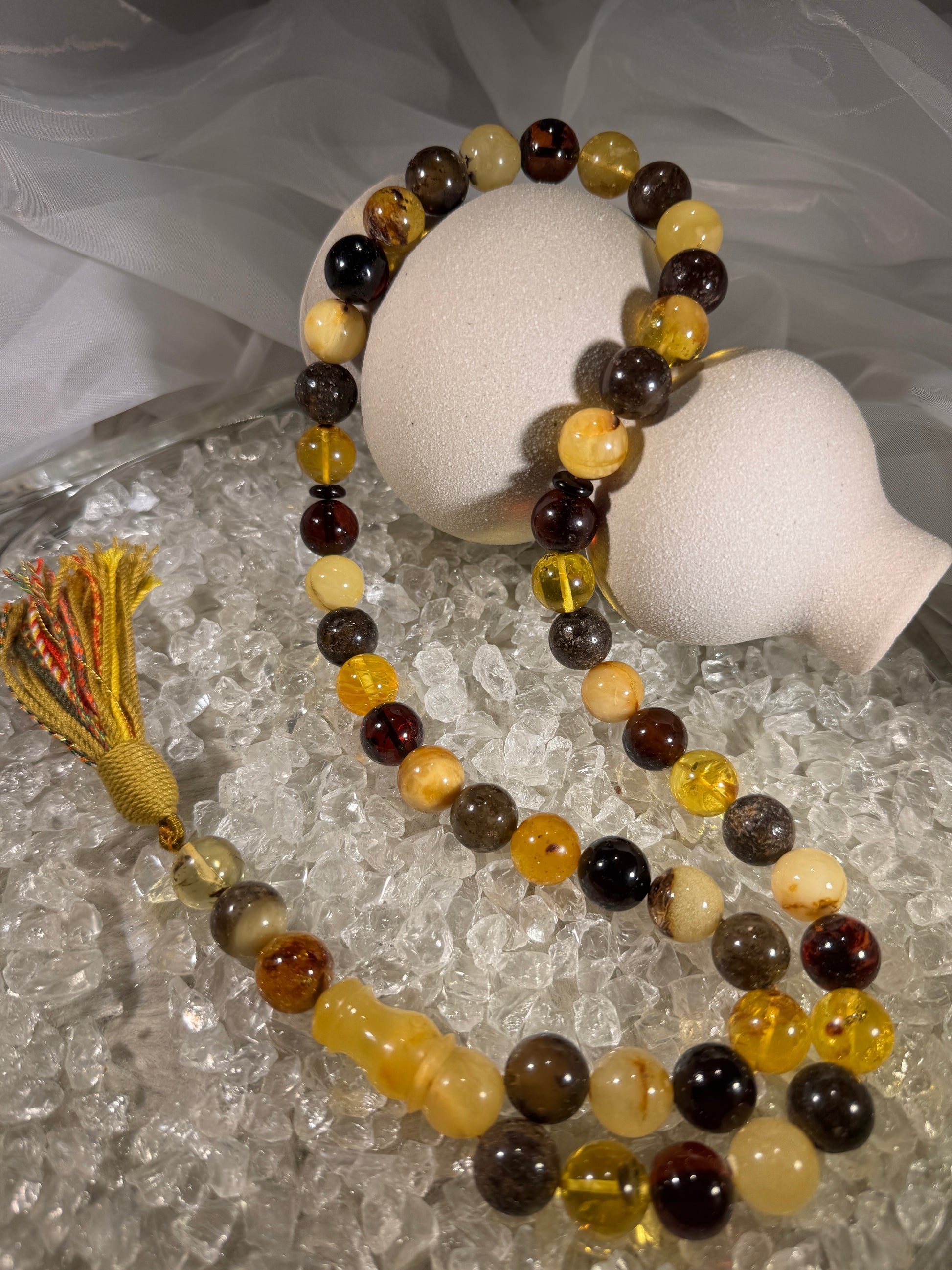 ✨ A multicolor Baltic amber masbaha. Featuring Macintosh-style round beads in shades of honey, butterscotch, cognac, and dark cherry amber, this tasbih reflects the natural diversity of amber – each bead unique in color and texture.