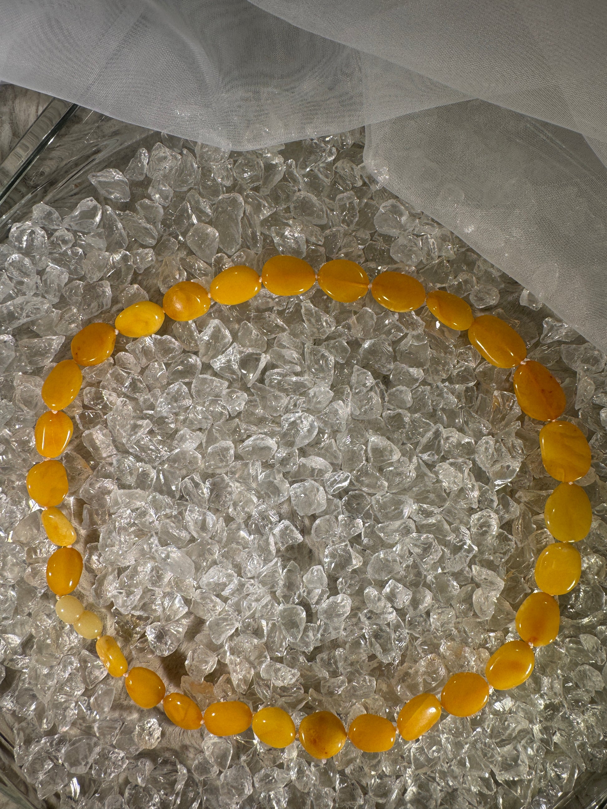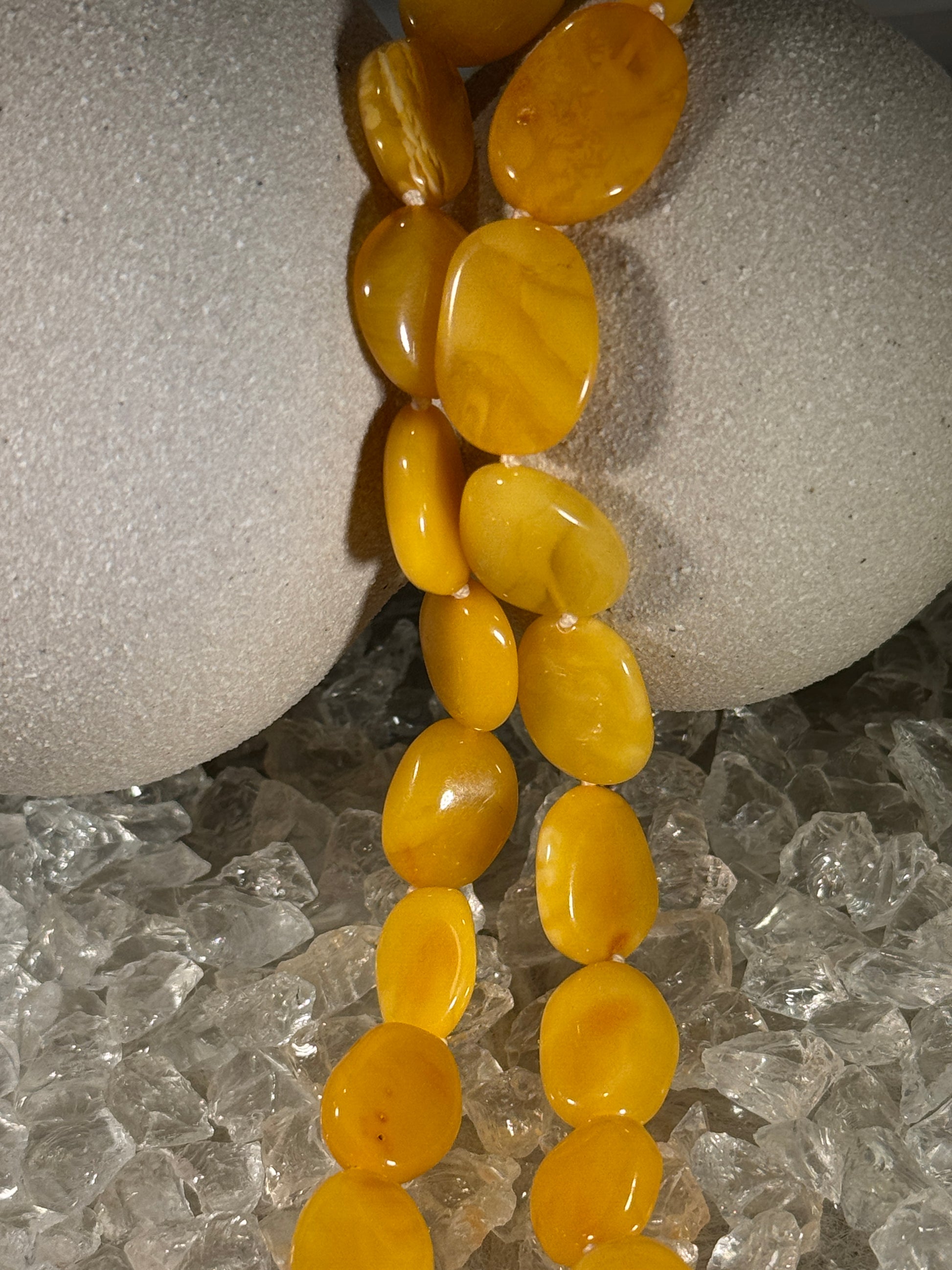 This Butterscotch Baltic Amber Necklace is a stunning statement of natural beauty and timeless craftsmanship. Hand-polished from genuine amber, each oval bead glows with warm golden tones — from creamy honey to deep butterscotch — creating a radiant and harmonious look.