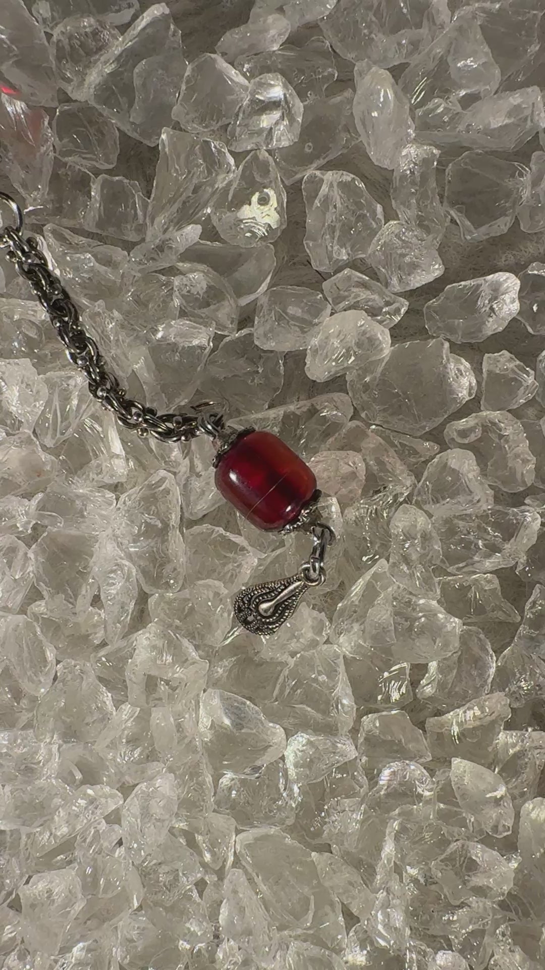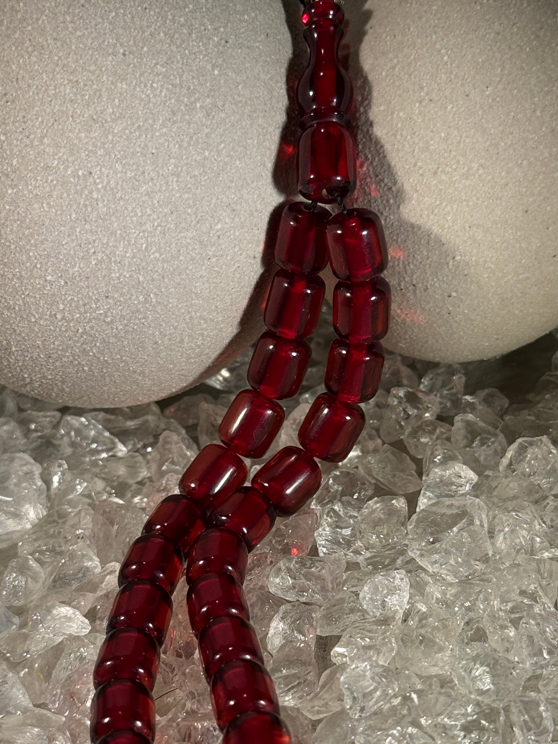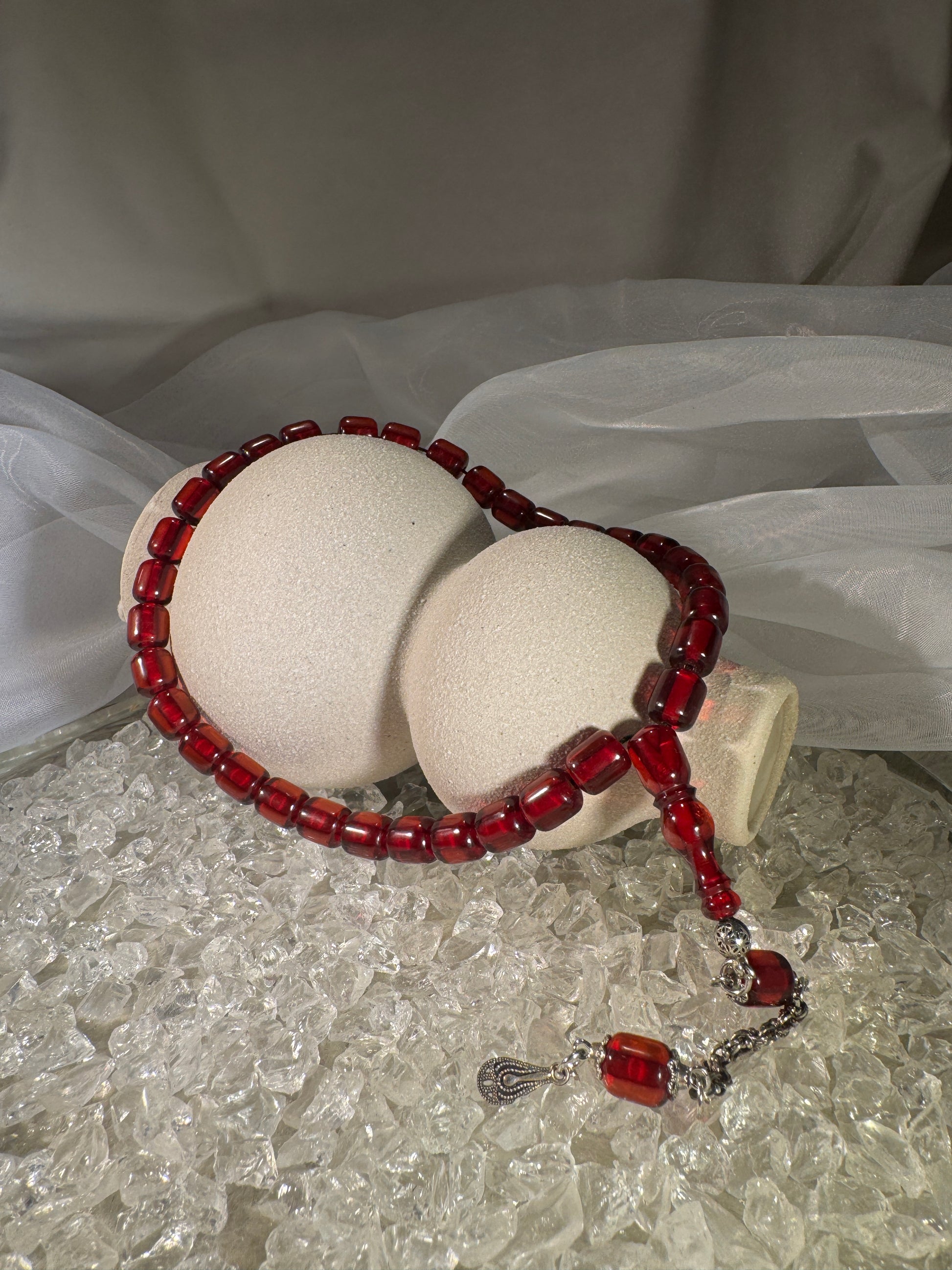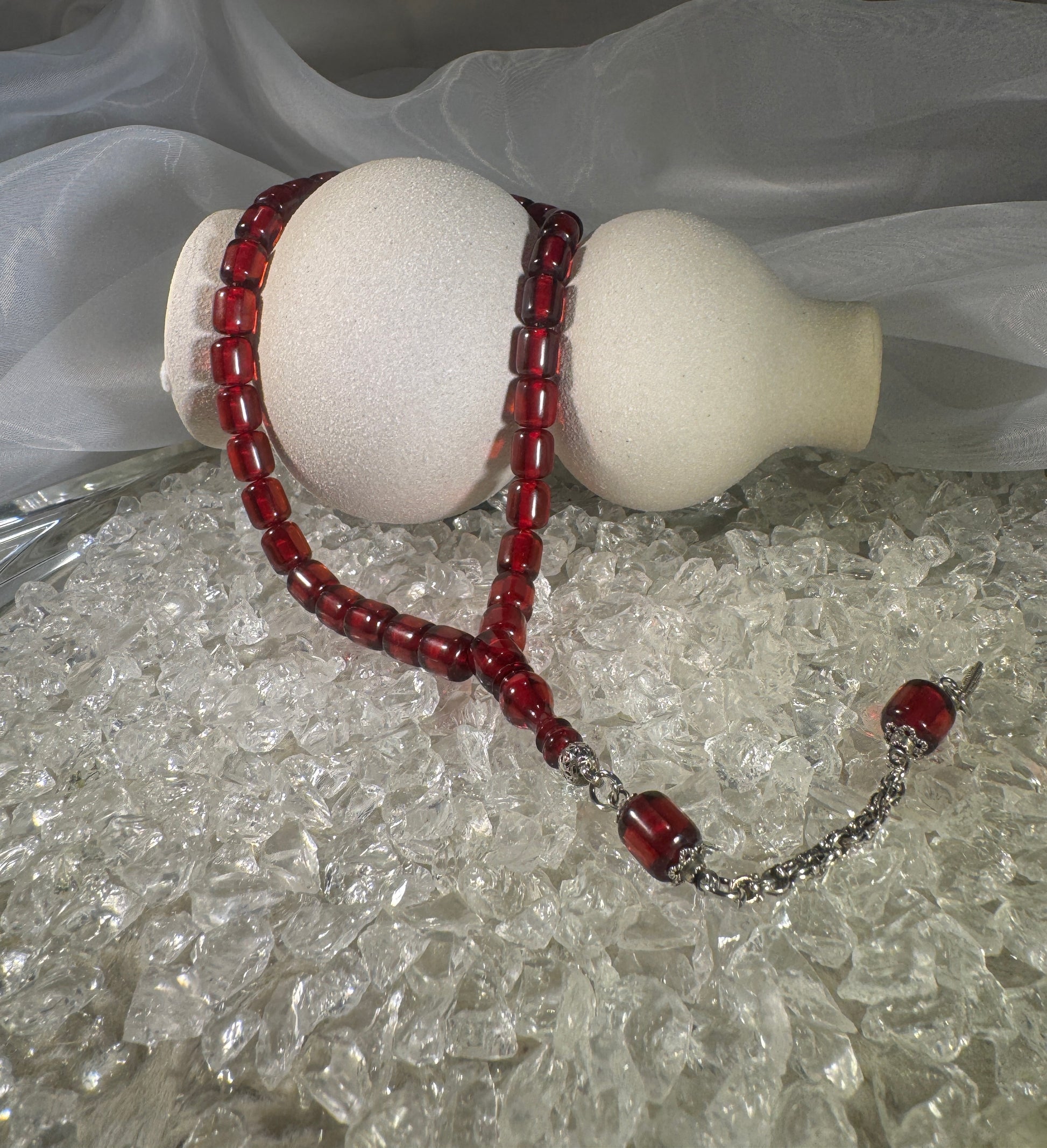 Immerse yourself in timeless elegance with this Deep Red Bakelite Misbaha, handcrafted with smooth barrel-shaped beads and a classic silver chain finish. Each bead carries the rich, deep hue and subtle translucence that make Bakelite tasbihs highly sought-after among collectors and spiritual enthusiasts alike.