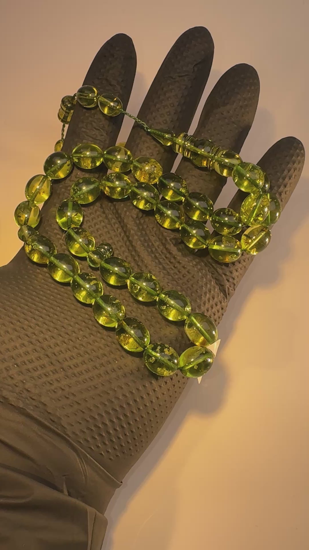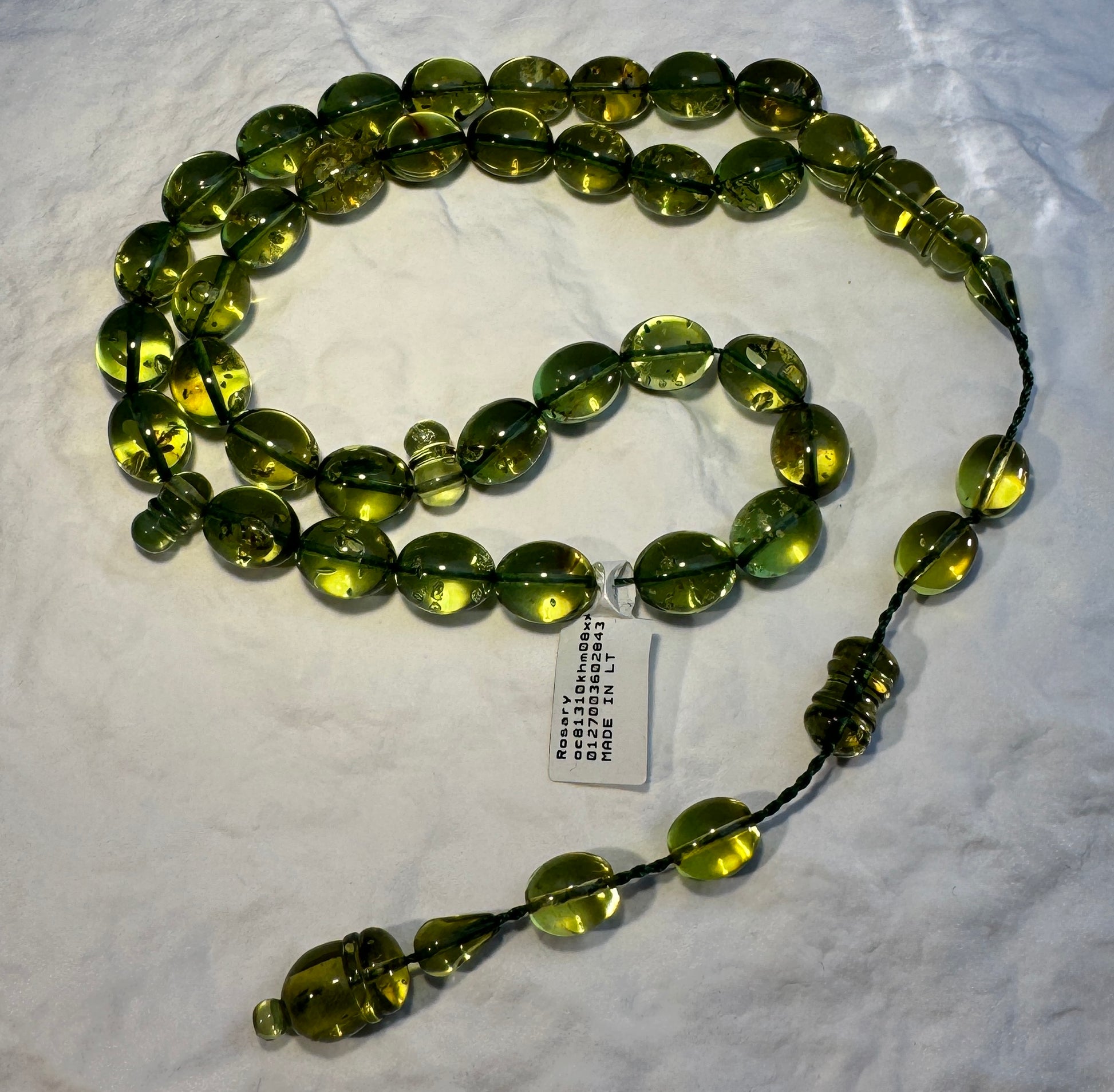 Crafted from rare green Baltic Amber, this tasbih embodies refinement and serenity. Each of the 33 beads is carefully shaped and polished to highlight amber’s natural transparency and internal glow. The olive-green hue reflects beautifully in light, offering a calming visual during dhikr and meditation.
