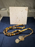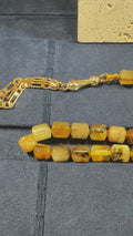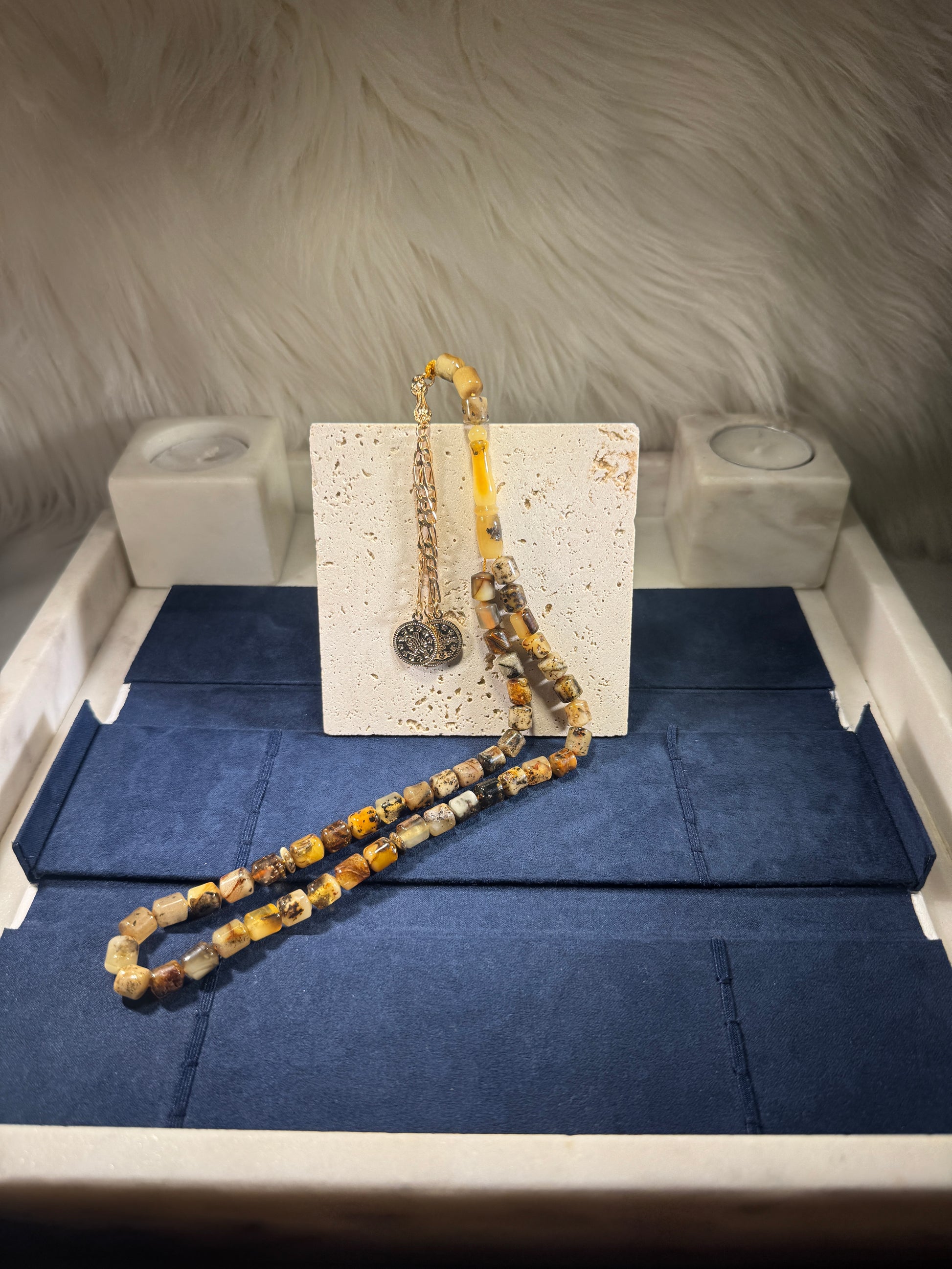 A rare and beautifully crafted piece, this Macintosh-style tasbih features natural Baltic amber beads in earthy, multi-tone shades. The 45+3 cube-cut beads are smooth, well-balanced, and strung on durable thread with a luxurious gold-tone charm chain.