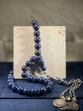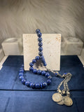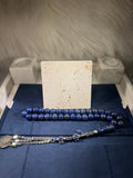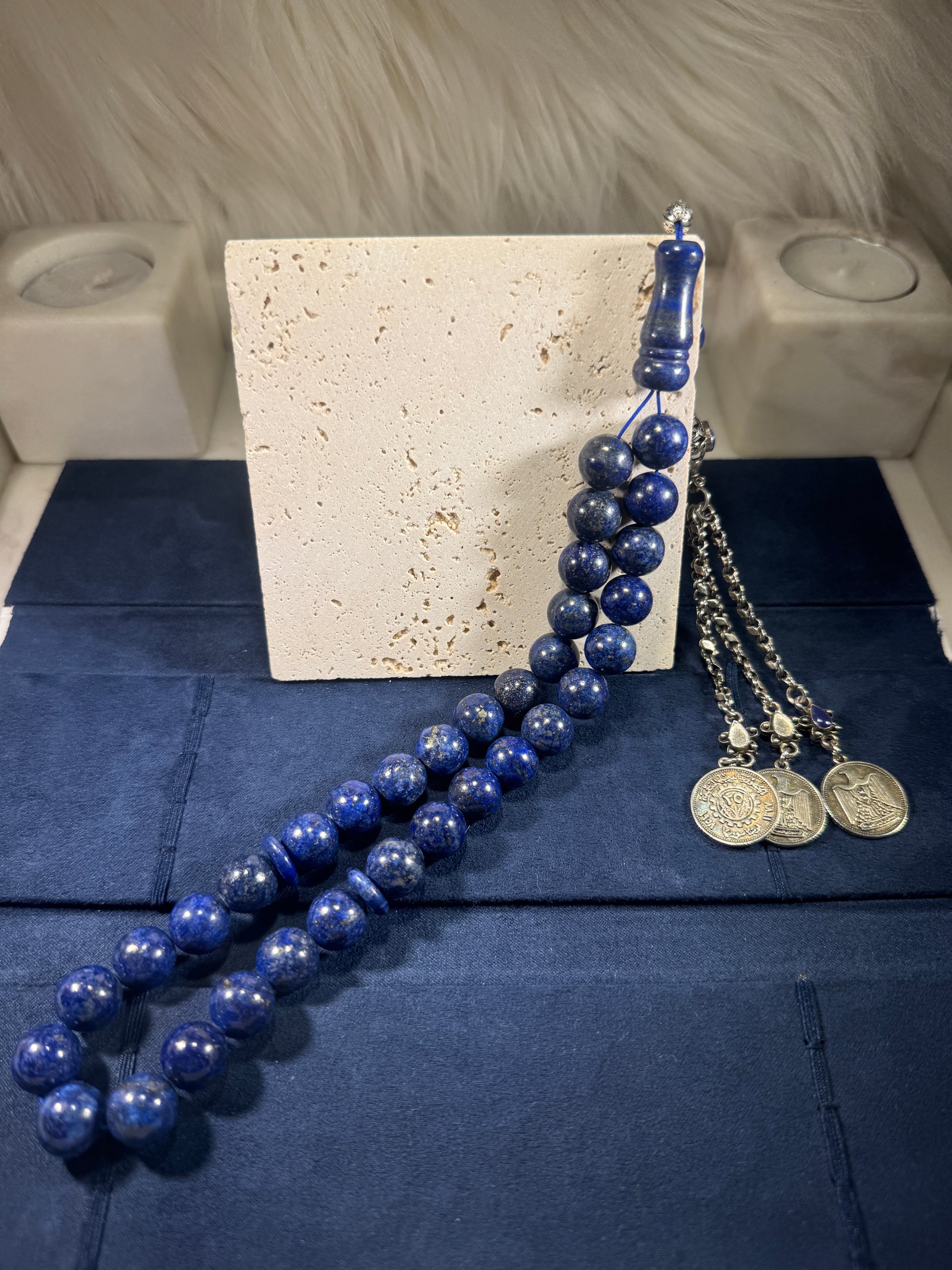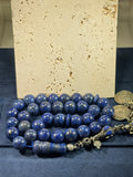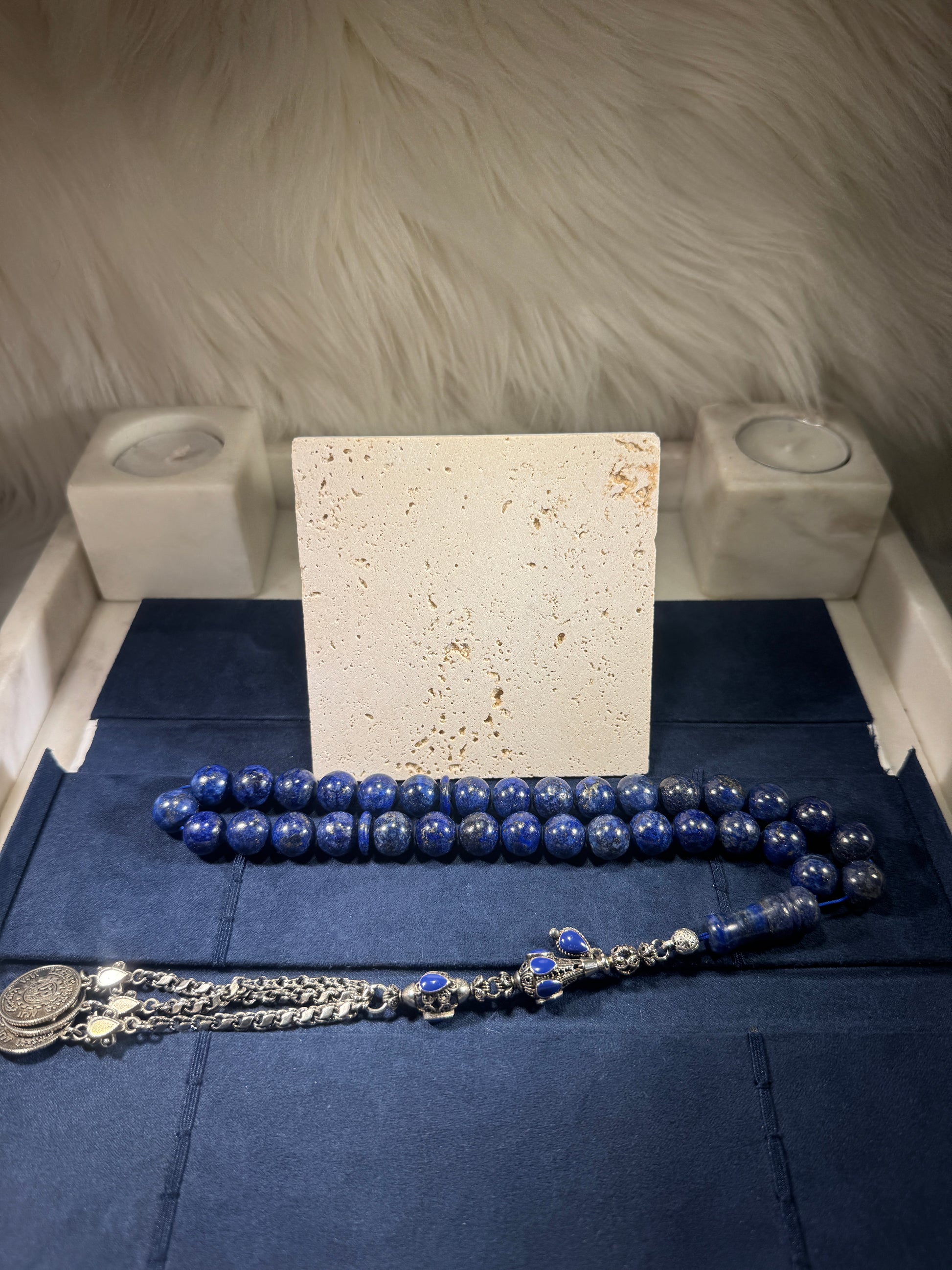 This handcrafted Lapis Lazuli (Lazourd) tasbih features 33 polished 13mm beads in a deep royal blue tone, accented with a decorative silver charm chain. With its rich natural color and substantial weight, it is a luxurious and spiritual piece perfect for dhikr, meditation, or gifting.