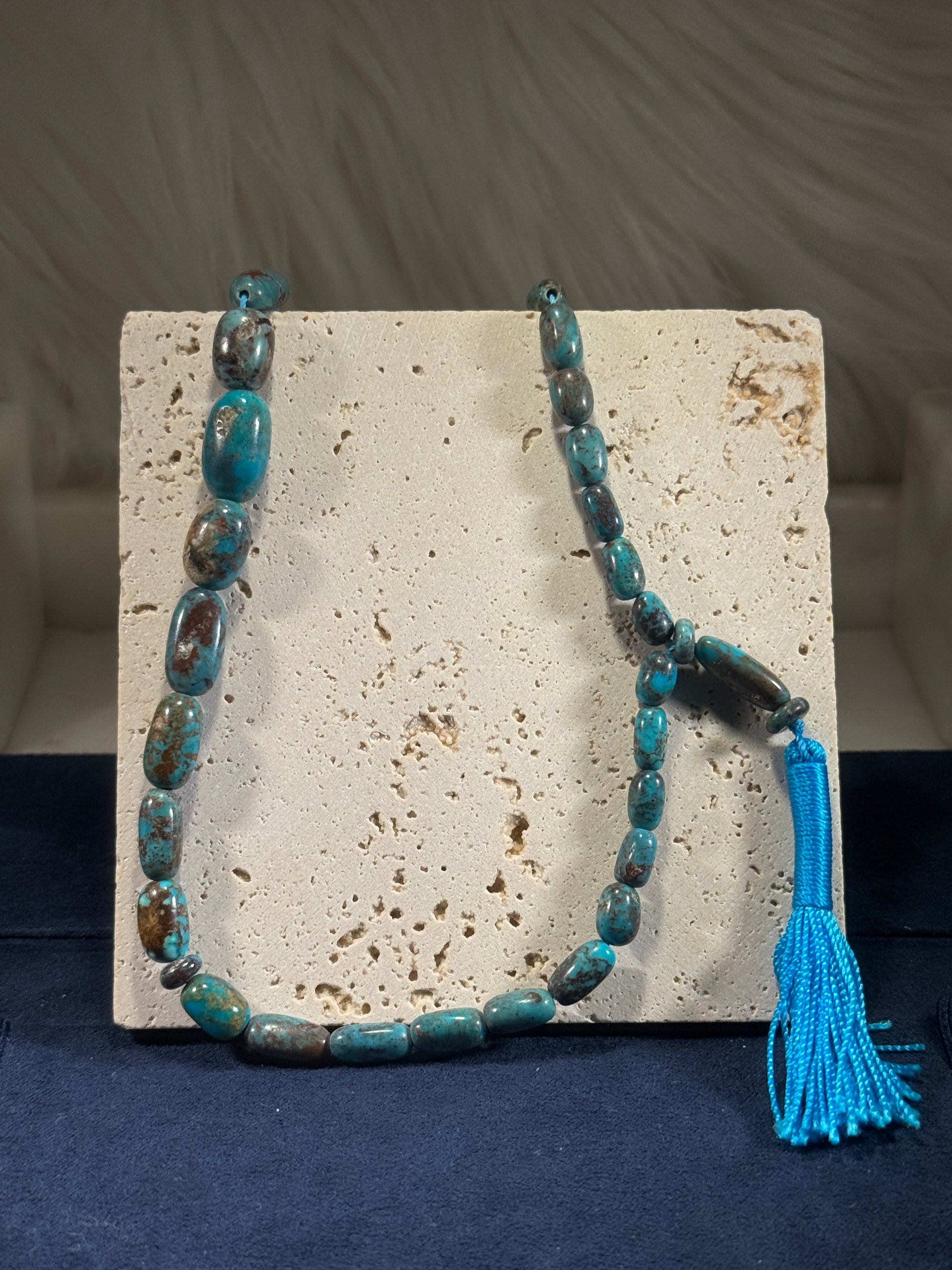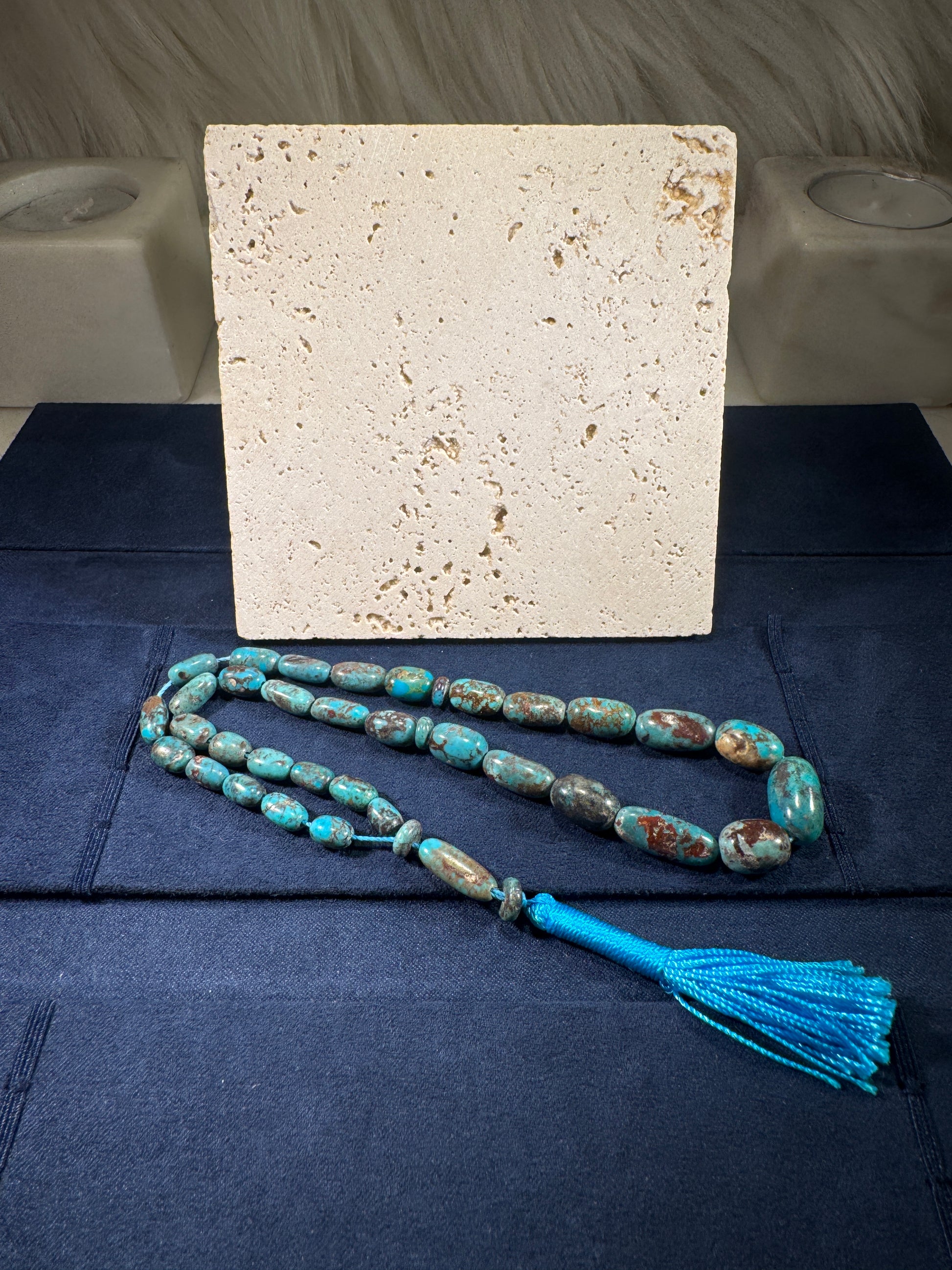 An authentic handcrafted tasbih featuring 33 beautiful Fayrouz (Turquoise) beads sourced from the historical region of Nishabour. Each bead varies slightly in size, showcasing the natural beauty of real turquoise stones, strung on a sturdy cord and finished with a striking blue tassel. A perfect everyday dhikr companion or heartfelt Islamic gift.