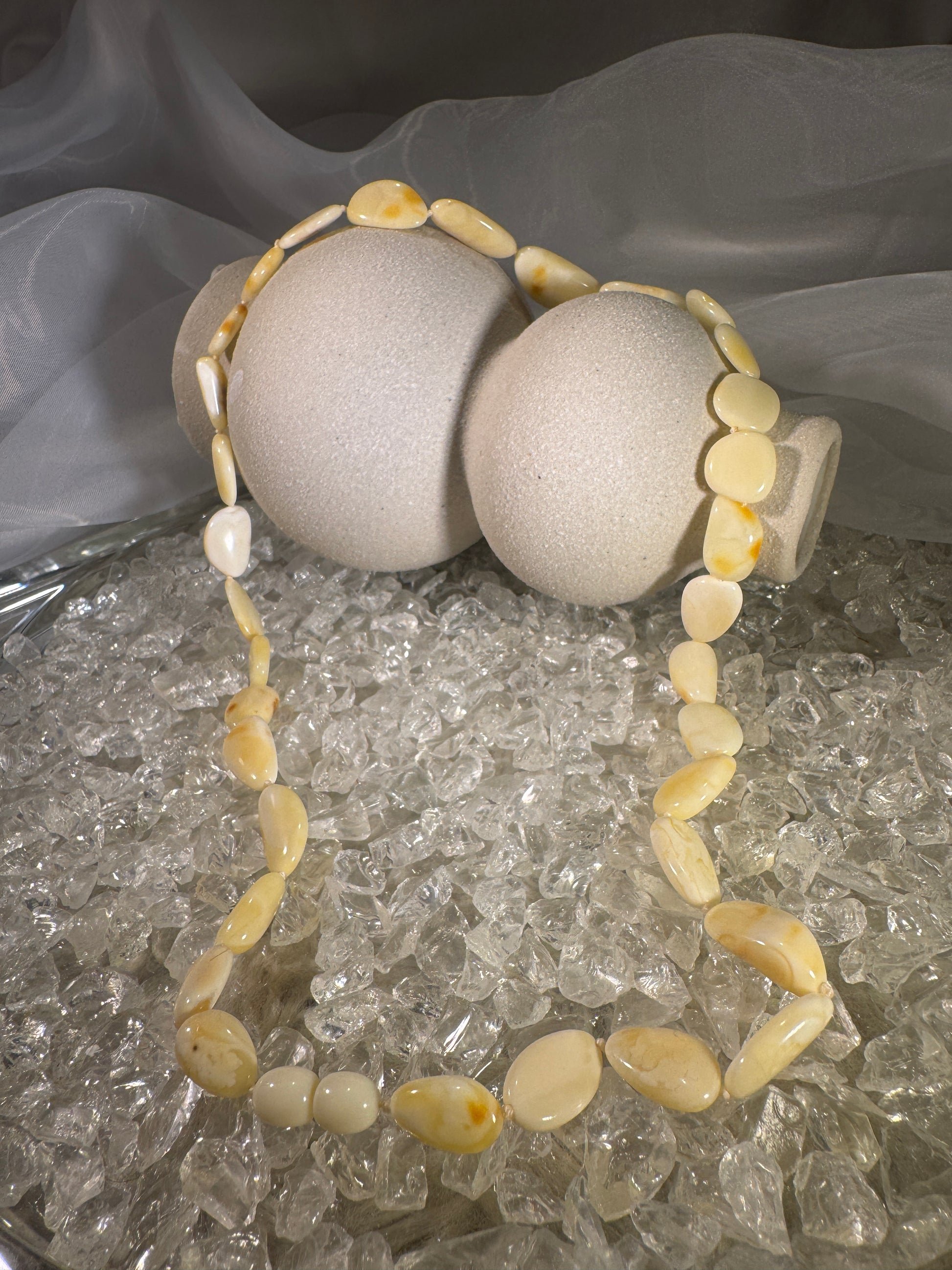 Experience subtle elegance and spiritual warmth with this White Baltic Amber Necklace, crafted from authentic buttermilk amber stones. Each bead carries a soft, creamy hue with gentle natural variations — from pale ivory to golden swirls — making every piece one of a kind.